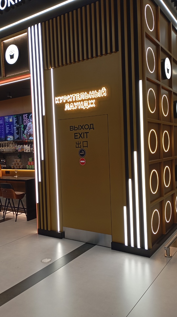 В нашей стране очень много курящих пассажиров. А законы всё больше и больше зажимают их, не давая спокойно насладиться никотином. Сам 20 лет курил и знаю, что самое сложное на транспорте, это выдержать перелет. Если на поезде можно переждать четыре часа между стоянками, взяв те же Никоретте, то в самолёте это сложнее. Приезжая, как и положено за несколько часов до вылета, вы проходите предполетный контроль и оказываетесь в чистой зоне. Тут достаточно долго придется ожидать рейс. Возможна и задержка. А это лишнее переживания. И хочется покурить. И тут вам на попадается на глаза приятная надпись "Курительный лаунж ". Такая красивая вывеска. Но оказывается не бесплатно. Тут нужно что-то купить в специальном кафе и потом зайти в комнату и наслаждаться курением. Но почему я что то должен платить? Нет, не должны. Не нравится, не платите. Не все знают, что есть подобное место, только совершенно бесплатно. Но оно не у входа. А данное кафе-курилка у входа. Вот многие сначала заплатят, а потом