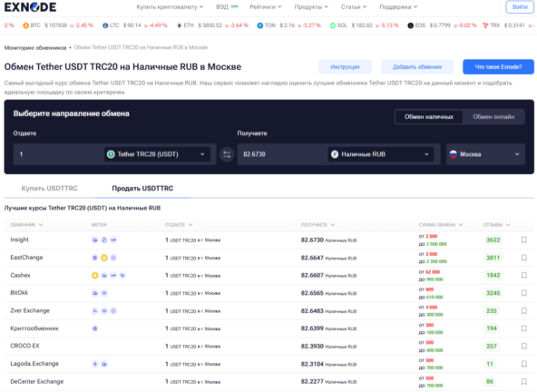 Первый шаг — выбор подходящей площадки. Проще всего сделать это через сервис мониторинга Exnode, где собраны актуальные криптообменники в Москве на наличные. На сайте отображаются направления обмена и актуальные курсы. Нажав на название выбранного обменника, можно сразу перейти к форме заявки. Этот этап важен: он помогает избежать случайных сайтов и выбрать партнёра с подтверждённой репутацией.