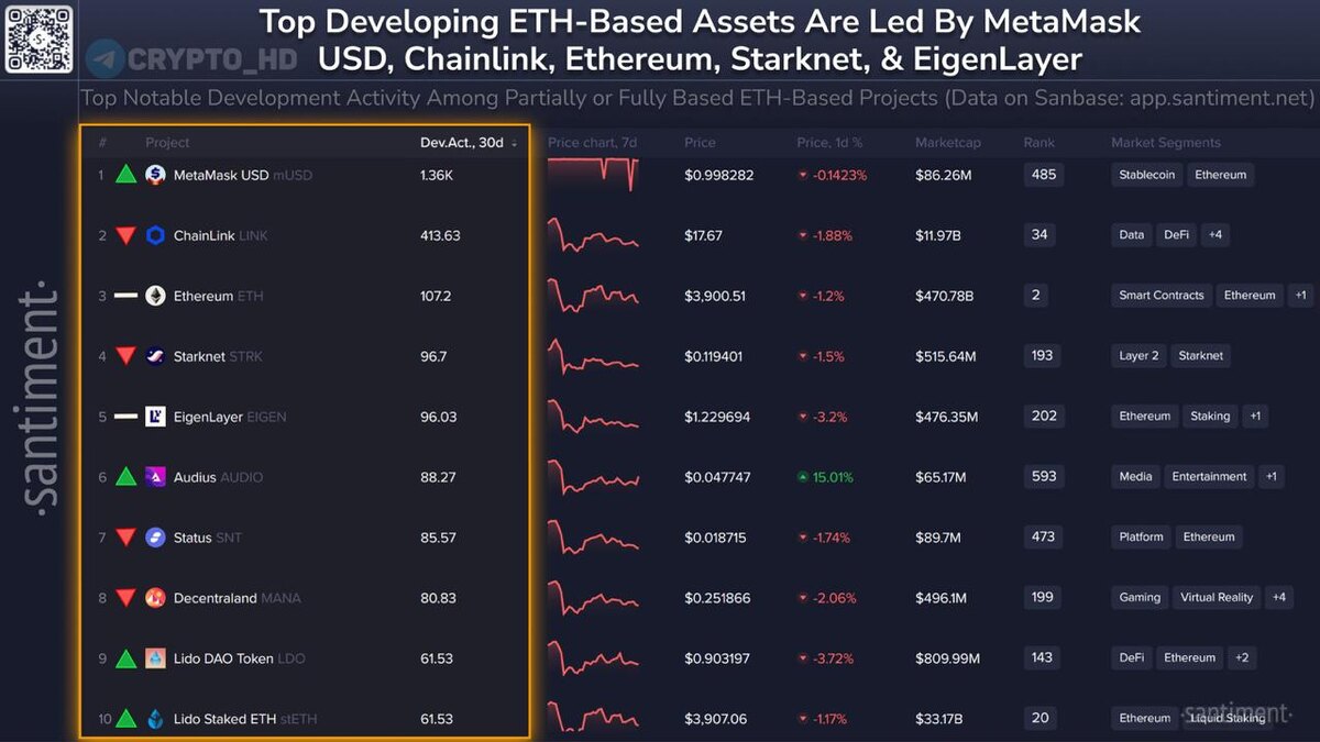 #ончейн #рейтинг 📊 Santiment: ТОП-10 проектов экосистемы Ethereum по активности разработчиков за последние 30 дней. 1. MetaMask USD #mUSD 2. Chainlink #LINK 3. Ethereum #ETH 4. Starknet #STRK 5. EigenLayer #EIGEN 6. Audius #AUIDO 7. Status #SNT 8. Decentraland #MANA 9. Lido DAO Token #LDO 10. Lido Staked ETH #stETH Ранее: прошлый топ Crypto Headlines