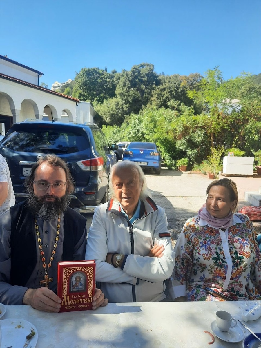 Иногда Господь устраивает нам самые неожиданные встречи. И кто бы мог подумать, что в храм в Нижней Ореанде на службу придет Илья Резник, знаменитый поэт-песенник. Помните добрую песню про Золушку, которую исполняла Людмила Сенчина: «Хоть поверьте, хоть проверьте, / Но вчера приснилось мне, / Будто принц за мной примчался, / На серебряном коне». Оказывается, он семь лет назад крестился, а ему было тогда 80 лет. С супругой Ириной они венчались. И представьте себе, Илья Резник настолько сердечно принял Христа, что с тех пор каждую неделю непременно посещает храм. Его творчество приняло духовный оттенок. Он написал книгу поэтических молитв. На трапезе после богослужения он читал нам свои стихотворения, и все мы, затаив дыхание, слушали и удивлялись, и благодарили Бога за Его дивный промысел. Ведь, согласитесь, это тоже важно, когда человек, известный на весь мир, вместо мирской славы ищет славы Божией, на первом месте поставляет храм и в своем творчестве обращается к духовной тематике. Вл