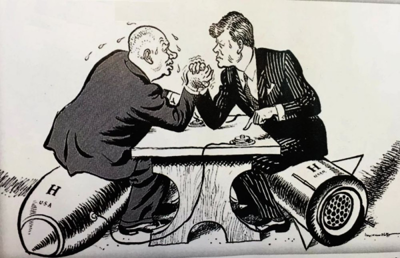 В октябре 1962 года мир оказался на волосок от ракетно-ядерной войны между СССР и США — случился кубинский (Карибский) ракетный кризис. Знаменитый британский карикатурист Лесли Иллингворт изобразил эту ситуацию на своём рисунке «Армрестлинг» — Никита Хрущёв и президент США Джон Кеннеди меряются силой, причём указательные пальцы обоих находятся в считанных сантиметрах от ядерных кнопок. И вместо стульев оба сидят на атомных бомбах — только у Кеннеди на бомбе написано «СССР», а у Хрущёва — «США».