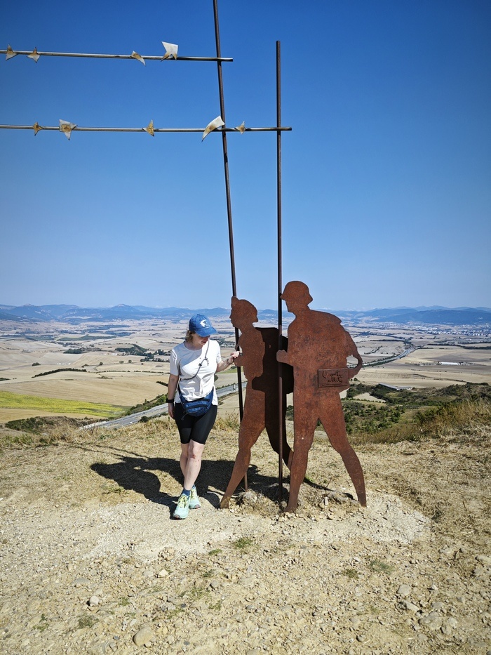 Написано 05.09. Сегодня по ощущениям был один из самых лёгких дней. Хотя там был подъем, спуск - который считают одним из сложнейших и после равнина на жаре без тени. Подъём мне действительно не понравился, спуск был действительно неприятным, но для меня любой спуск легче любого подъема, и никакие царапины на ногах меня в этом не переубедят. На вершине между этими подъемом и спуском знаковое место для всех пилигримов - Альто дель Пардон (дай бог не ошиблась в написании) или по-другому "Плато прощения". Здесь располагается скульптура, изображающая пилигримов с фразой "Там, где путь ветра пересекается с путем звезд" - которая говорит нам о постоянно дующем на холме ветре (там штук 40 ветряных мельниц) и знаковых для пилигримов звезд, ведь именно звезда когда-то по легенде указала пилигриму место гробницы Иакова. А для меня этот холм был знаковым тем, что именно там у меня увели мою трекинговую палку. Начался день с того, что я обнаружила что палка у меня уже всего одна и судя по всему за