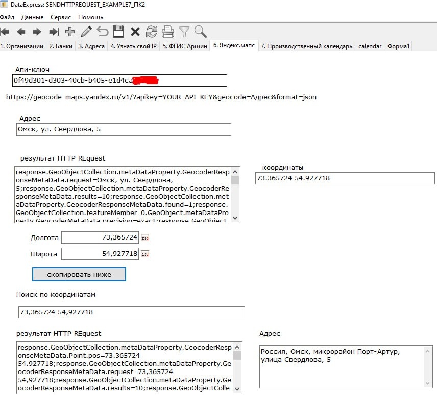 Кстати, в тему модуля для HTTP запросов https://forum.mydataexpress.ru/viewtopic.php?f=16&t=5323 добавил пример использования апи геокодера Яндекс карт https://yandex.ru/maps-api/docs/geocoder-api/index.html апи-ключ для них можно бесплатно получить здесь https://developer.tech.yandex.ru/services/3 Пример показывает поиск координат по адресу и поиск адреса по координатам.