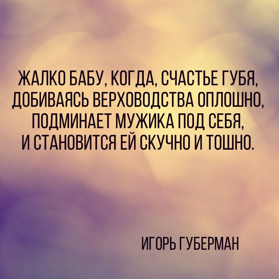 «Счастлива баба, когда, мудрость обретя, оставив попытки верховодить оплошно, идёт со своим мужиком, не подминая, а рука об руку. И становится ей светло и не тошно».