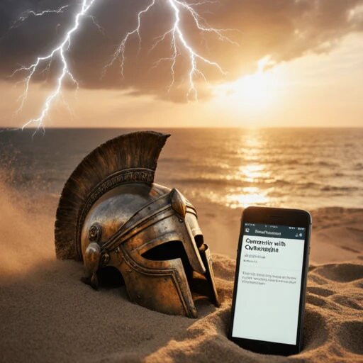 Золотой рассвет над морем. В песке лежит античный шлем, рядом — смартфон, экран вспыхивает словами «Сеанс связи с Олимпом установлен». Ветер поднимает пыль, молния мелькает в облаках. Атмосфера — древняя легенда встречает научную фантастику.