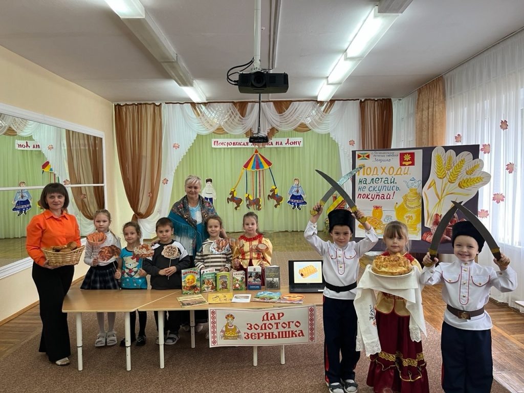 Библиотекарь рассказала присутствующим, что Хлеб — один из самых удивительных продуктов человеческого труда. Недаром народ создал пословицы «Земля-матушка, а хлеб-батюшка». Мы встречаемся с хлебом каждый день. Без него не обходится ни скромный завтрак, ни будничный обед, ни праздничный стол. Каким бы ни был обильным, разнообразным наш стол, но без хлеба не обойтись. Ребята познакомились с историей появления хлеба, вспомнили пословицы и поговорки о самом необходимом продукте, узнали о первом в России Музее хлеба, поучаствовали во вкусной викторине о хлебе. Познакомились с рассказами, сказами и притчами о хлебе. Библиотекарь прочитала донской сказ «Цена хлеба и золотой кареты».