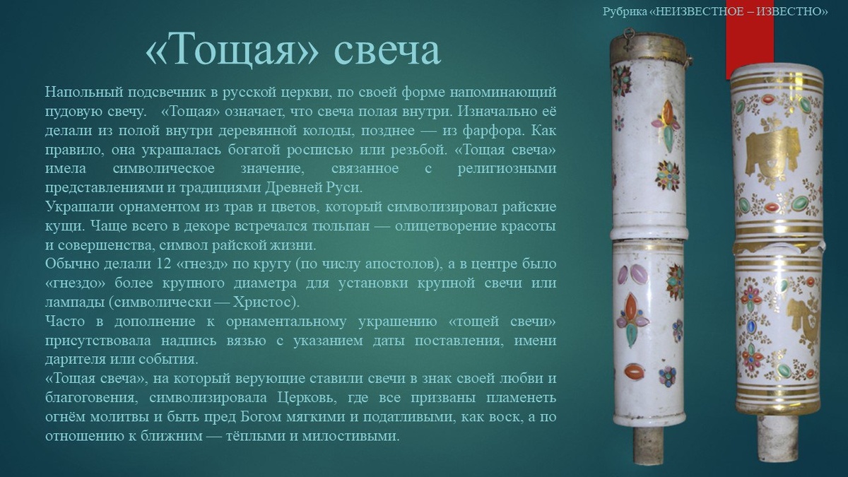 Тощая" свеча – новое выражение в нашей еженедельной рубрике. На слайде фотография двух "тощих" свечей конца XIX века. Они поступили в фонды Угличского музея 24 сентября 1976 года. Обе свечи в виде двух фарфоровых цилиндров белого цвета, соединённых металлическим стержнем. Продолжение на нашей страничке ВК: #углич