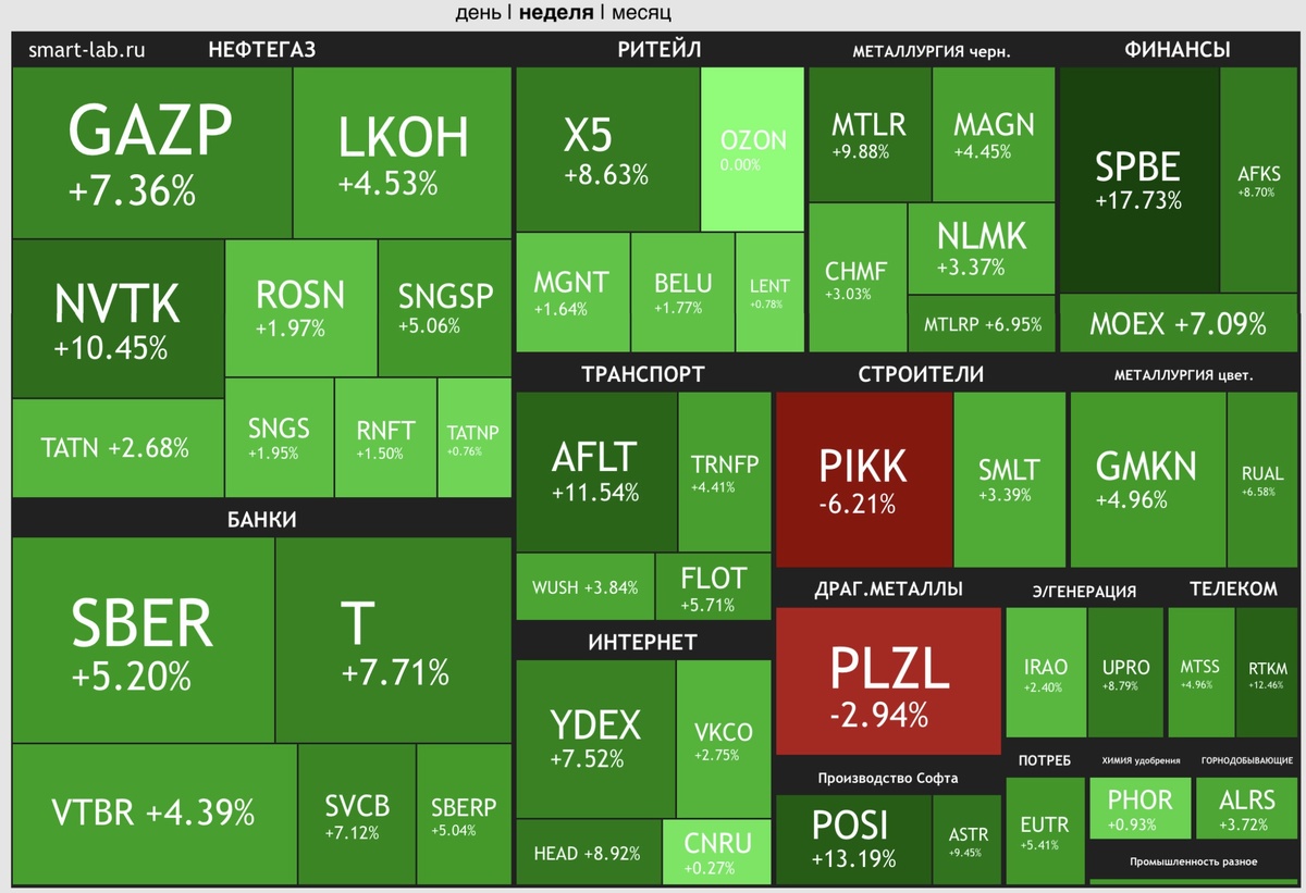 Итоги недели Как феникс из пепла, восстал наш фондовый рынок на уходящей недели. Причиной всему вновь становится геополитика. Вчера стало известно об очередном телефонном разговоре лидеров РФ и США по ситуации урегулирования украинского конфликта. По итогам разговора планируется встреча советников высокого уровня, а после и личная встреча президентов РФ и США. Индекс Мосбиржи на этих новостях резко развернулся от свои годовых минимумов. По итогам торгов четверга Индекс показал самый большой однодневный рост в текущем году — +6,97%. Основную торговую сессию в пятницу Индекс заканчивает на уровне 2720 пунктов, показывая рост +5,1% за неделю. До этого уже были подобные реакции рынка, но вскоре позитив немного притихал и за бурным ростом следовала незначительная коррекция. Несмотря на это, попытки продолжения диалога мировых лидеров по достижению мира являются позитивным фактором как для рынка, так и для будущего в целом. Данные по инфляции: Рост потребительских цен в РФ с 7 по