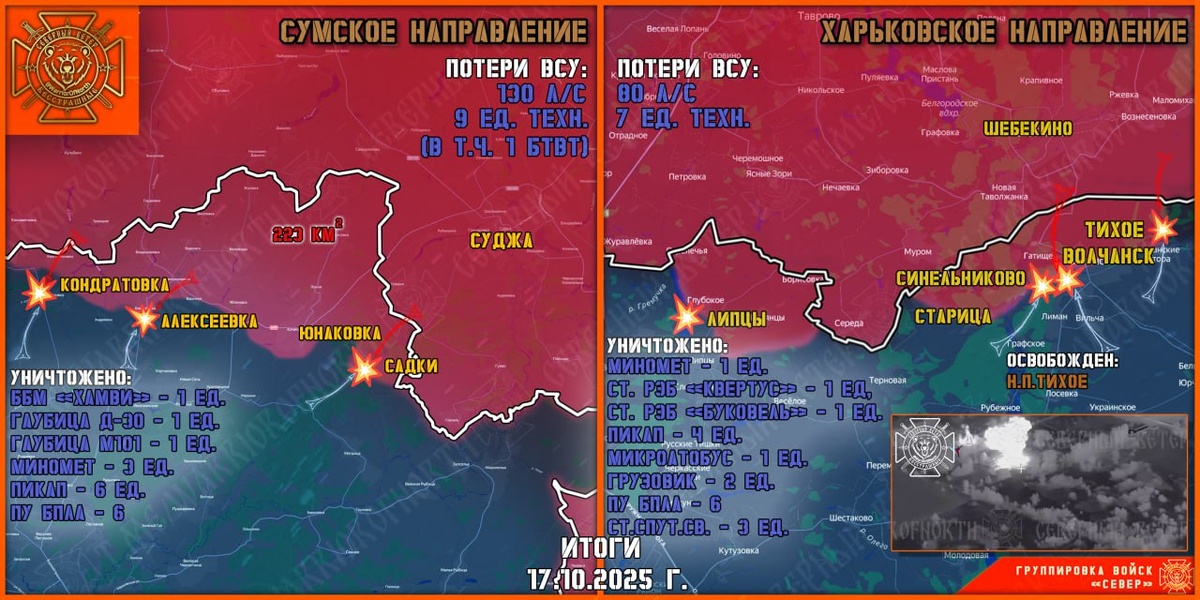 У курской границы бойцы РФ уничтожили почти роту ВСУ По информации телеграм-канала «Северный Ветер» на утро 18 октября, группировка войск «Север» продолжает перемалывание вражеских сил недалеко от курского приграничья. Идут ожесточенные бои. Именно по этим местам работает российская авиация, расчеты ОТРК и БПЛА «Герань-2». Они вчера целый день наносили удары по всей линии фронта в Сумской области. В районе Кондратовки российские военные комплексным огневым уничтожили две боевые группы 158 омбр и 225 ошп при попытке выдвижения в направлении позиций бойцов РФ. В ходе боев бойцы РФ практически полностью ликвидировали 3 роту 3 мехбата 47 омбр. Уточняется, что более половины ВСУшников числятся пропавшими без вести. - Противник продолжает восстанавливать боевой потенциал штурмовых подразделений и готовится к новым контратакам, - говорится в сообщении телеграм-канала.