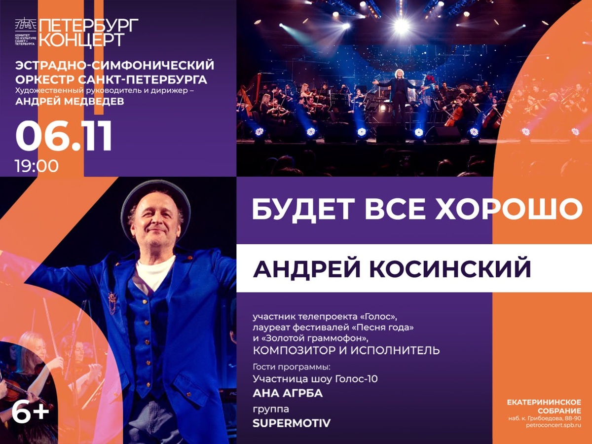 6 ноября в Екатерининском собрании композитор, музыкант и певец Андрей Косинский представит программу «Будет всё хорошо». Это не просто обещание, а констатация факта — именно такое ощущение рождается от его музыки. Песни артиста — это часть звучащего Петербурга. «По Галерной улице», «Нева-Нева», «Корюшка» давно уже стали визитной карточкой Северной столицы. Их, как и многие другие хиты, написанные для Леонтьева, Апиной, Глызина, Боярского и A’Studio, можно будет услышать в авторском исполнении. Как верно заметил Михаил Боярский, лучший исполнитель песен Косинского — сам Косинский. Творчество солиста «Петербург-концерта» не укладывается в рамки одного жанра. Смена музыкальных языков и интонаций вам точно обеспечена. Авторские аранжировки Андрея Косинского зазвучат по-новому в исполнении блистательного Эстрадно-симфонического оркестра Санкт-Петербурга под управлением маэстро Андрея Медведева. В этот ноябрьский вечер на одной сцене с Косинским — аутентичная а капелла группа SUPERMOTIV,