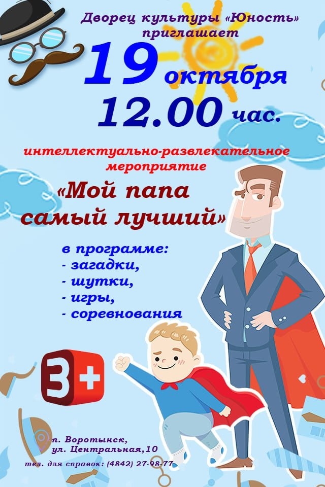 👨👦👦 19 октября в 12:00 в «Дворце культуры «Юность» состоится интеллектуально-развлекательное мероприятие «Мой папа самый лучший