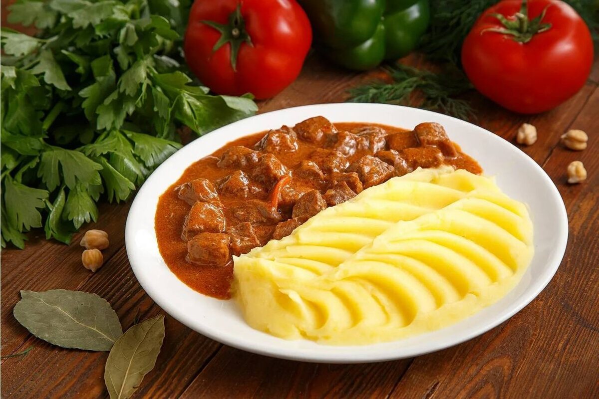 🍖 Гуляш по-домашнему (из «Книги о вкусной и здоровой пище», 1961 г.) Классическое блюдо советских столовых и домашней кухни. Сытное, ароматное и простое в приготовлении! 📌 Ингредиенты (на 4 порции): Основные: •Говядина (лопатка/грудинка) — 600 г •Лук репчатый — 3 шт. (крупные) •Томатная паста — 2 ст.л. •Мука — 1 ст.л. •Вода/бульон — 2 стакана •Масло растительное — 3 ст.л. •Специи и овощи: •Лавровый лист — 2 шт. •Перец черный горошком — 5-6 шт. •Соль — по вкусу •Морковь — 1 шт. (по желанию) •Картофель — 4-5 шт. (для гуляша с гарниром) Приготовление: 1. Подготовка мяса: Мясо промыть, обсушить, нарезать кубиками 3×3 см. Обжарить на хорошо разогретом масле до румяной корочки. 2. Тушение основы: Лук нарезать полукольцами, добавить к мясу. Обжарить до мягкости лука. Добавить томатную пасту, готовить 2-3 минуты. Посыпать мукой, перемешать. 3. Доведение до готовности: Залить горячей водой/бульоном до покрытия мяса. Добавить лавровый лист, перец, соль. Тушить под крышкой на медленном огне