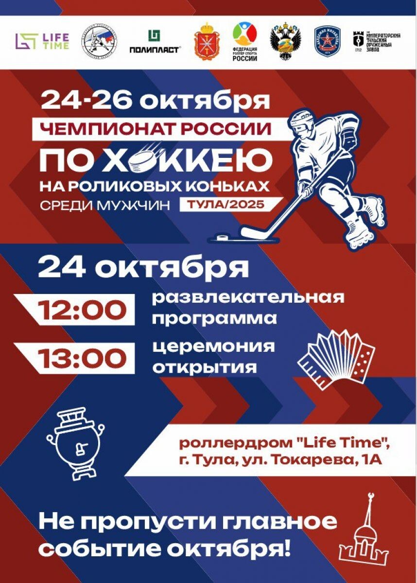 С 24 по 26 октября 2025 года Тула станет местом проведения Чемпионата России по хоккею на роликовых коньках среди мужчин. Впервые в истории главные соревнования по этому динамичному виду спорта состоятся на тульской земле, а именно на роллердроме «Лайф Тайм». В чемпионате примут участие семь сильнейших команд из Москвы, Московской области, Тулы и Тюмени. Тульский регион будет представлен двумя командами – «Оружейник» и «Левша». Сразу после церемонии состоится первый матч чемпионата. Организаторы приглашают всех желающих посетить соревнования и поддержать тульские команды. Чемпионат продлится до 26 октября, финальные игры и церемония награждения пройдут на роллердроме «Лайф Тайм». Приходите всей семьей, поддержите тульских спортсменов и почувствуйте адреналин роллер-хоккея! Не упустите главное спортивное событие октября в Туле! Место проведения: роллердром «Лайф Тайм», г. Тула. Даты проведения: 24–26 октября 2025 года. 12+