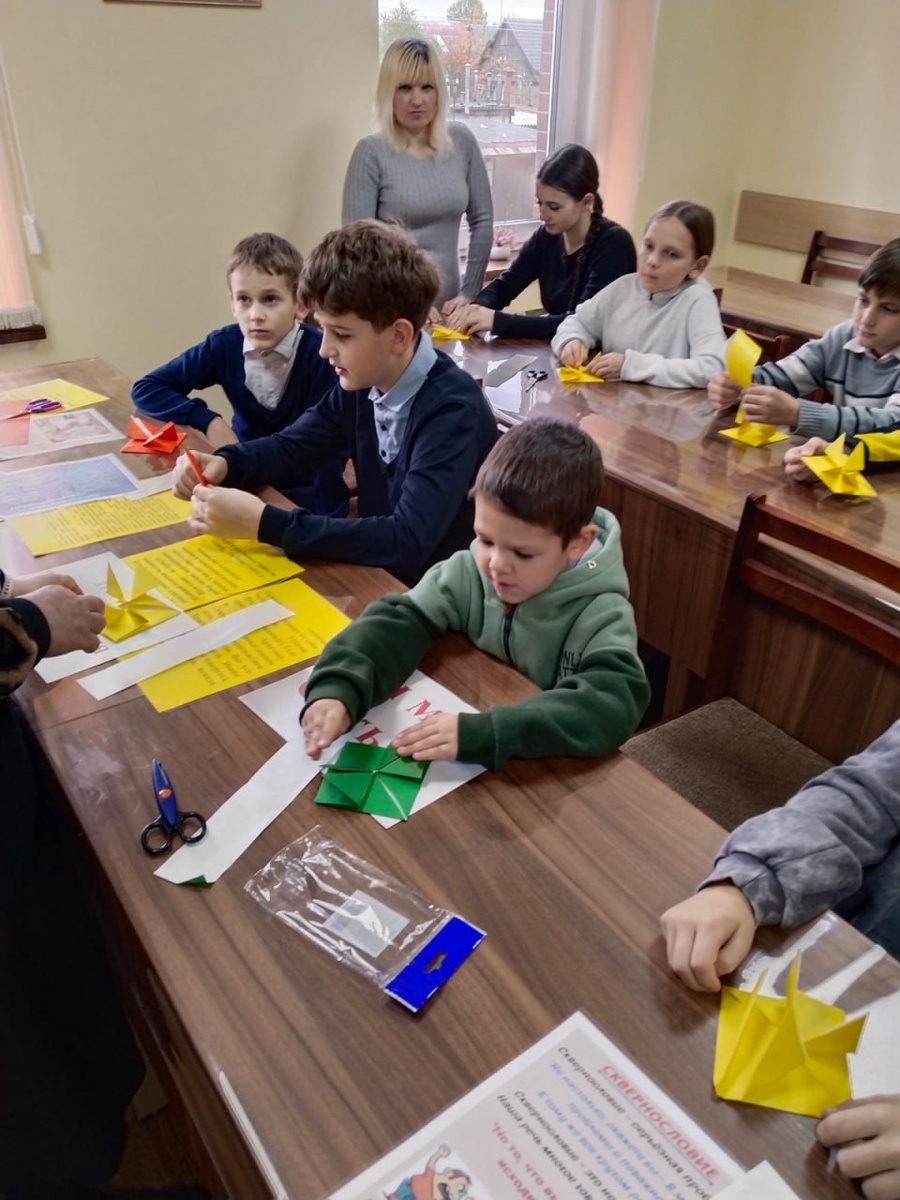 Родители с детьми увидели трогательную выставку рисунков воскресной школы «Истоки» — «Моя любимая мамочка», сделали вместе оригами «Сердечко» на мастер-классе с педагогом Татьяной Витальевной Решетняк и посмотрели православный мультфильм «Сотворение мира».