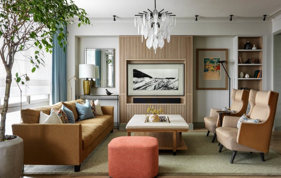 Люстра в гостиной похожа на стеклянное облако на потолке. А медиашкаф с фасадом из вертикальных реек собирает центр композиции и задает вертикаль.