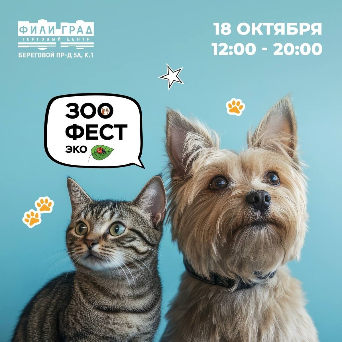 🆓 «ЗООФЕСТ ЭКО» - выставка-пристройство кошек и собак из приютов 🗓️18 октября 📍 ТЦ «Фили Град» @filigradmall Уникальная возможность подарить обездоленным пушистикам дом, семью и счастливые моменты. С 12:00 до 20:00 вас ждёт тёплая встреча с очаровательными котиками, собачками, щенками и котятами: -15 котят -15 взрослых котиков -13 щенков -12 взрослых собак! Уверены, они покорят ваше сердце, а может и наполнят чью-то жизнь новым смыслом. Важно: возьмите с собой паспорт на тот случай, если решите забрать домой особенно понравившегося хвостика. А ещё будет большая праздничная программа! С 14:00 до 17:00 - викторины, подарки и яркая детская анимация. С 13:00 до 18:00 - бесплатный тематический аквагрим. Заскучать мы вам точно не дадим! Вход свободный и бесплатный. 🆓Бесплатно Подробнее ЗДЕСЬ @Together_with_kids Пост носит информационный характер Поддержать канал голосом ЗДЕСЬ