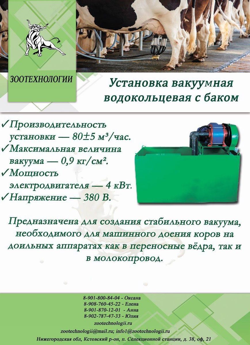 Добрый день. В продаже установка вакуумная водокольцевая с баком УВВ-70-1, которая предназначена для создания стабильного вакуума в вакуумной системе доильных установок разных модификаций. Особенности конструкции: ✅Все металлические элементы окрашены полимерно-порошковым методом, что увеличивает коррозионную стойкость оборудования, работающего в условиях агрессивной среды и сырости. ✅Двойной натяжитель ременной передачи исключает перекос в плоскости вращения шкивов, что снижает нагрузку на электродвигатель и продлевает срок службы ремня. ✅Вакуумные гофрированные, армированные силиконовые патрубки исключают «глухой» перегиб, что обеспечивает бесперебойный забор воды из бака в вакуумный насос. Оставить заявку можно у наших менеджеров: Оксана: 8-901-800-84-04 Елена : 8-908-760-45-22 Анна: 8-901-870-12-01 Юлия: 8-902-787-47-33 Будьте с нами ВКонтакте (https://vk.com/zootechnologii) ✅ #Вакуумные_ус