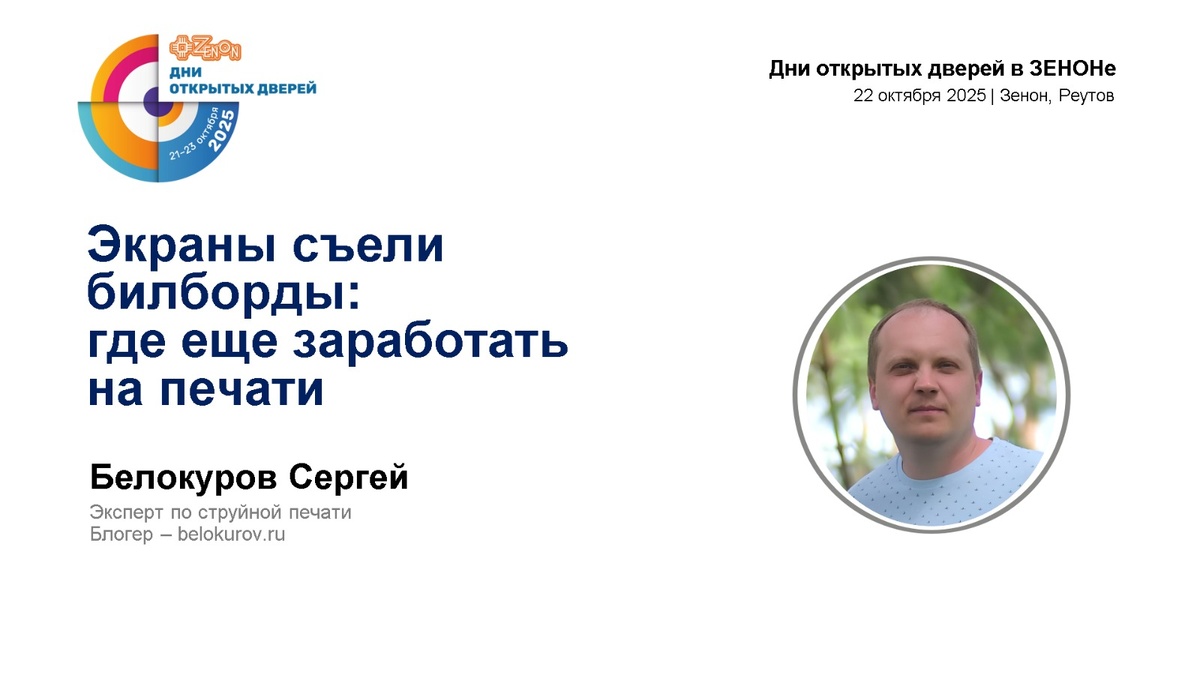 «Экраны съели билборды: где ещё заработать на печати» Я подниму вопрос, о котором большинство участников рынка предпочитают молчать, но сталкиваются с ним каждый день. Постараюсь ответить на главный вопрос, который сейчас звучит в голове у каждого печатника страны: Где ещё можно заработать на печати РПК? 📍Место проведения: демо-зал компании ЗЕНОН, г. Реутов.