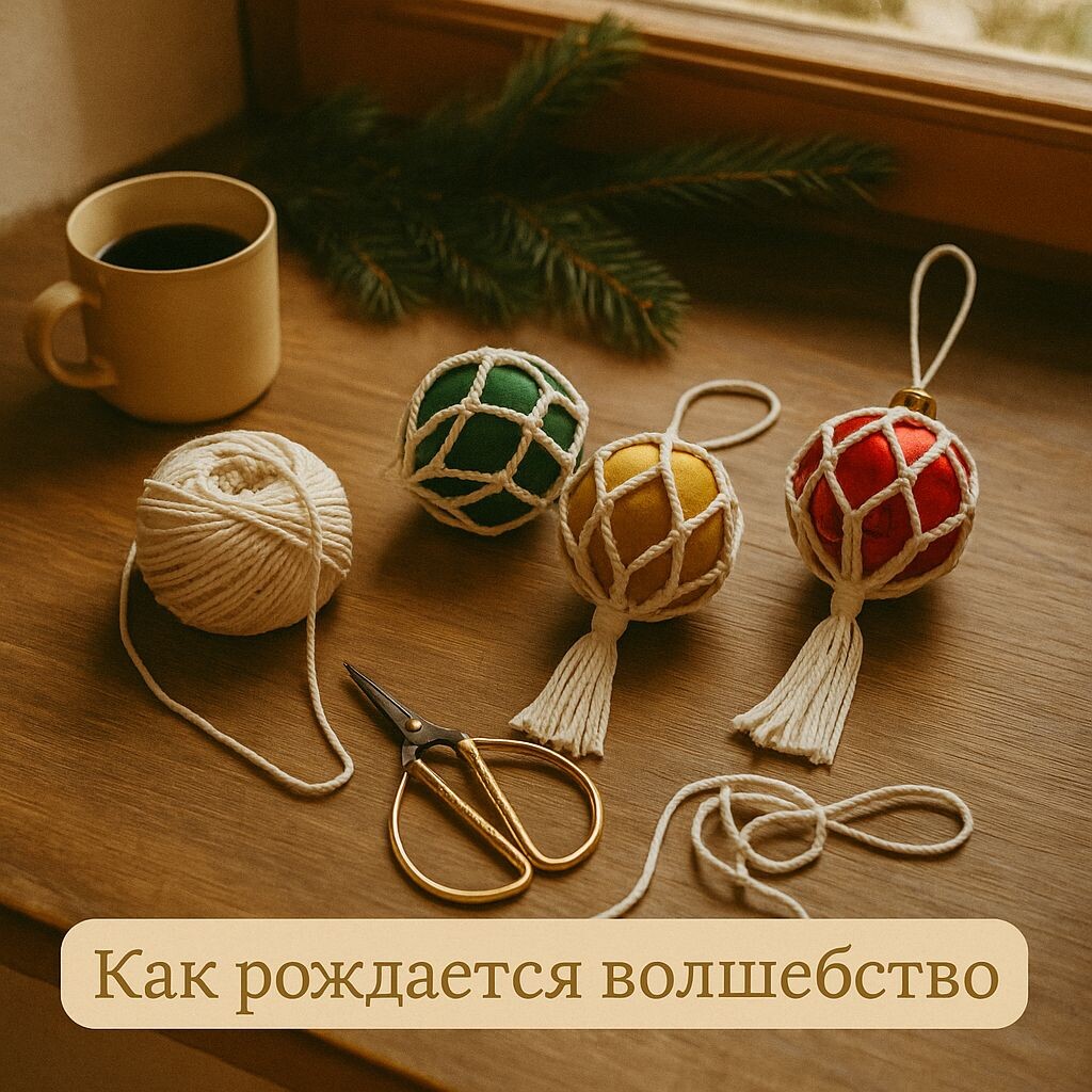 Утро мастера - не про кофе, а про узлы. Пока за окном хмурится небо, на моем столе уже разложены шнуры, щёлкают ножницы раз, два,три,... сколько нужно отрезать, чтобы хватило оплести шарик, об этом знает только моя сантиметровая лента 😀. Каждая игрушка проходит через руки десятки раз - я приглаживаю бахрому, поправляю узлы, чтобы всё было идеально. Это не поток работы - это маленькое волшебство, которое живёт в каждом шаре. Хочешь заглянуть закулисье и увидеть как рождаются они ?