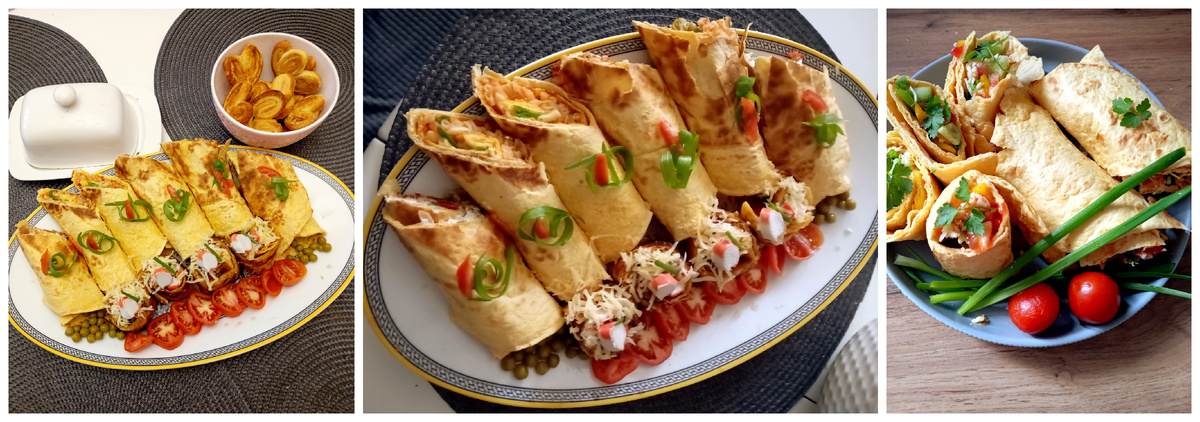 Доброе утро, день или вечер, дорогие читатели! Сегодня у меня опять лепёшки с разными начинками. Не всё успела сфотографировать, но понятно, что какая бы начинка не была в сырной лепёшке, всегда будет вкусно. Купили три вида разных лепёшек на пробу. Эти лепёшки со вкусом сыра и имеют кармашек, можно внутрь класть начинку. Размораживать можно в микроволновке не открывая упаковки. Эти лепёшки сырные и каждая переложена специальными листами бумаги и разогреваются на сковороде, бумагу снять необходимо. Эти лепёшки мне понравились очень. Эти лепёшки с зеленью, ещё не пробовала в приготовлении. Утром я, готовила макароны с отварным куриным филе, луком и кетчупом Лечо. Так вот решила попробовать с такой макаронной начинкой сделать рулетики из лепёшек. Сверху выложила зелёный лук, добавила майонез. Вторая начинка была из такого вот крема-фиша. Мне очень понравился, такой крем-фиш. Каждую лепёшку завернула в рулетик, разрезала на две части наискосок и выложила на блюдо. На рулетики с кр