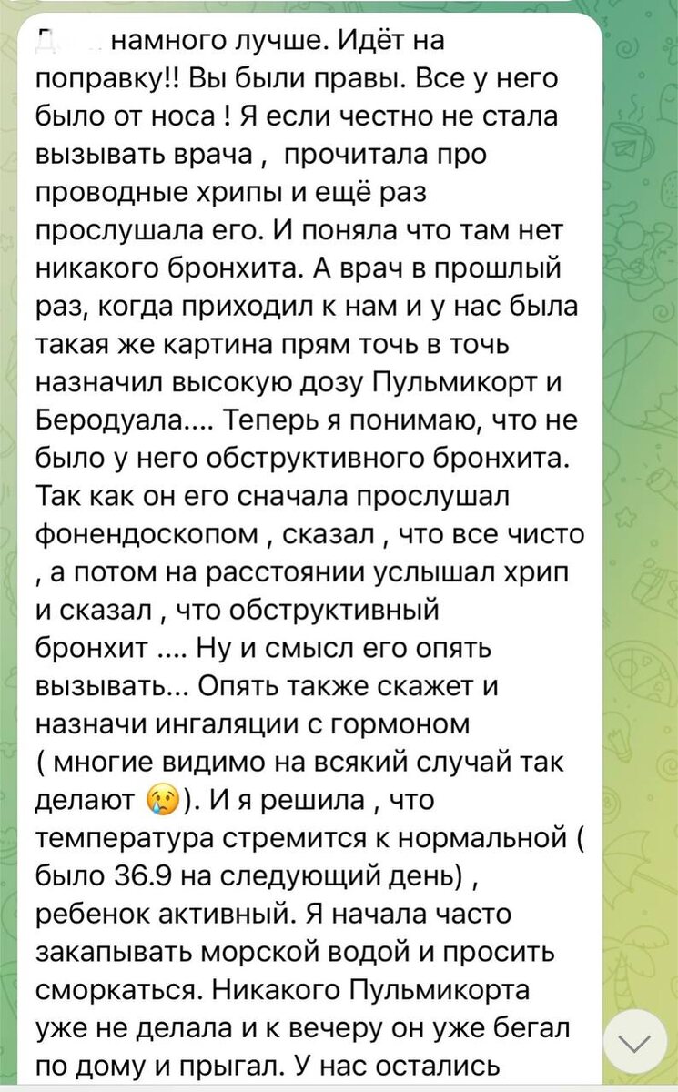 Когда болеет ребёнок очень важно посоветоваться с доктором, который не навредит и не захочет отделаться Мирамистином, Беродуалом, Пульмикортом. Есть очень талантливые педиатры, но есть такие, которые просто перебирают препараты. У меня на участке, когда я была заведующей в детской поликлинике был такой, он приходил на вызов домой к ребёнку и назначал каждый раз новый препарат, мне рассказали об этом несколько мам, которые пришли писать жалобы, потому что каждый раз все заканчивалось пневмонией. Но дело не всегда даже в назначениях или компетентности доктора, иногда бывает что мама не слышит рекомендации, а только ждёт волшебной таблетки, которая избавит её от надобности поить ребёнка, полоскать и промывать, уделять время, а ведь это одна из самых важных целей которые преследует малыш, когда заболевает-получить маму! Почитайте что пишет мама ребёнка в фото, я не просто делаю назначения, я учу рассуждать и быть здоровыми. Если вам нужна консультация или вы хотите действительно разобрат