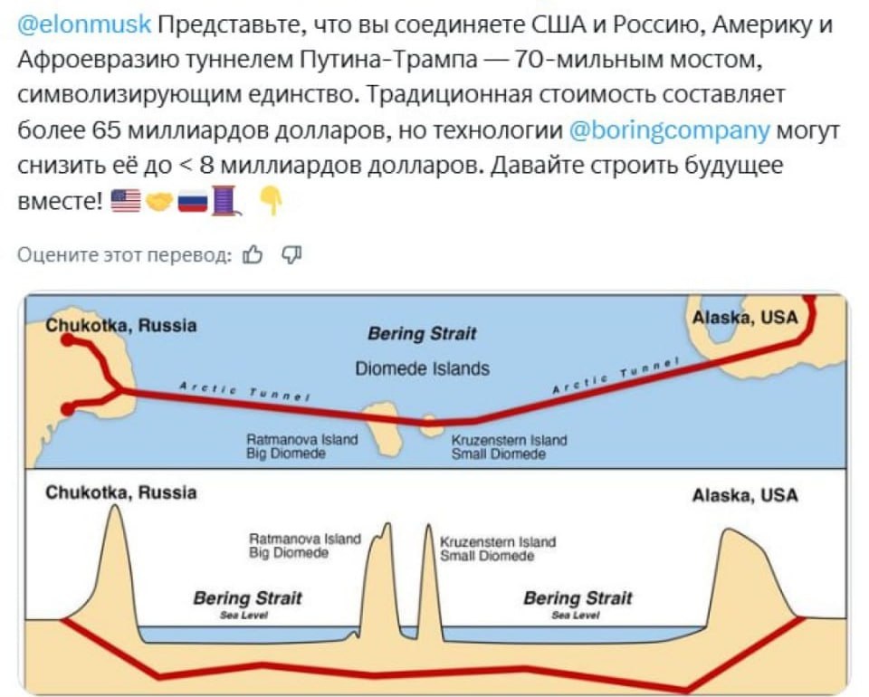 Россия — Аляска — тоннель. $8 миллиардов под Беринговым проливом, чтобы закопать деньги и смысл. Автор идеи — спец по фантастике Кирилл Дмитриев. Маску предложили копать. Трамп оценил как «интересно». Ну да, особенно объяснять это Конгрессу. Между делом: у США и России репутация чуть теплее, чем воды под тем самым проливом. Но почему бы не начать дружбу с дырки в земле.