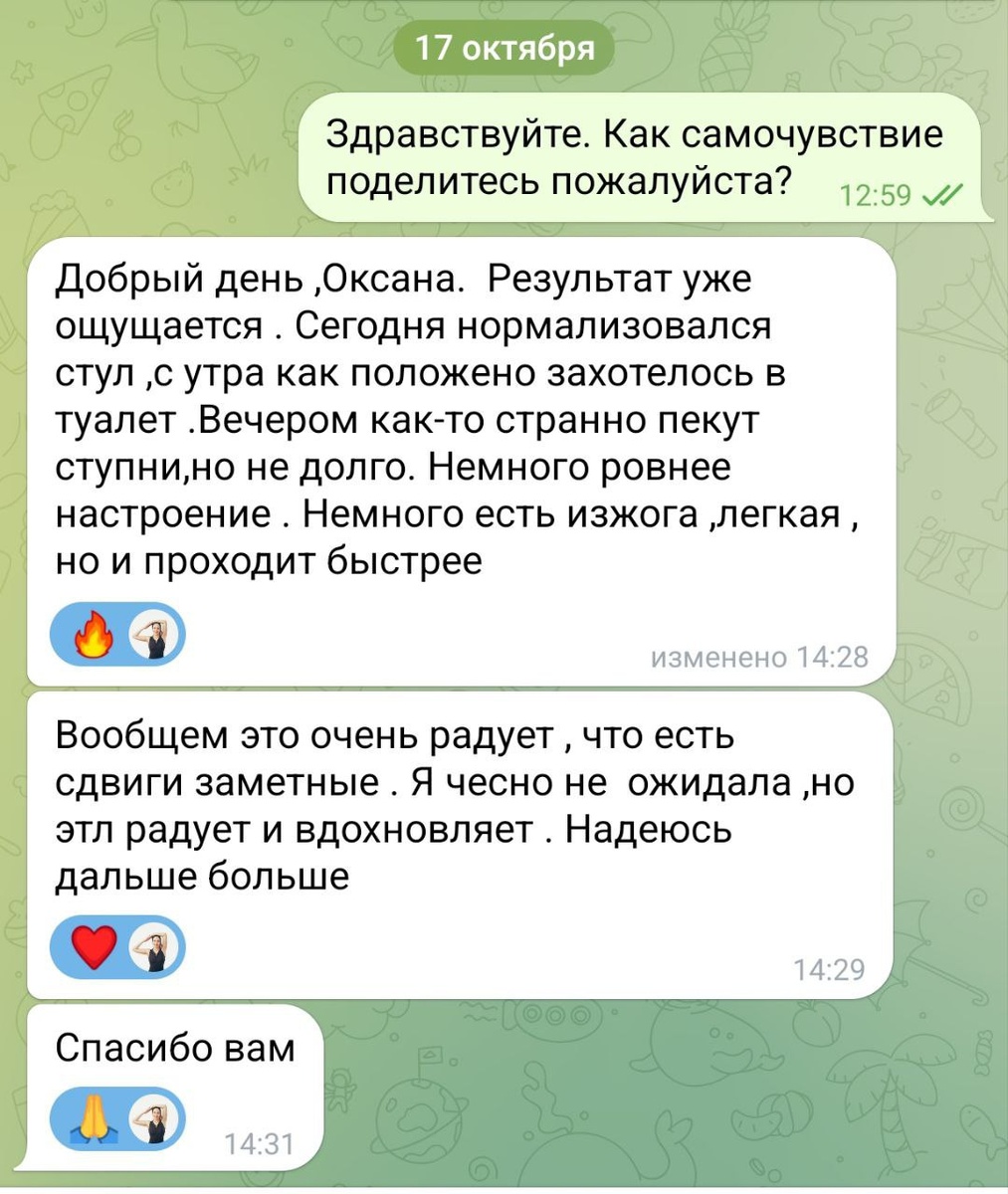 На фото — отзыв моей клиентки, у которой уже через несколько дней после начала выполнения рекомендаций восстановился естественный утренний стул.