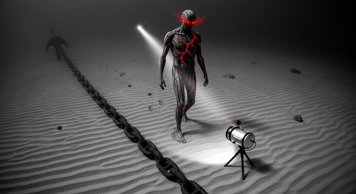 Он выстрелил. Существо отреагировало с невероятной скоростью: схватило гарпун, а его свечение стремительно поменялось с оранжевого на жёлтый, затем на синий.