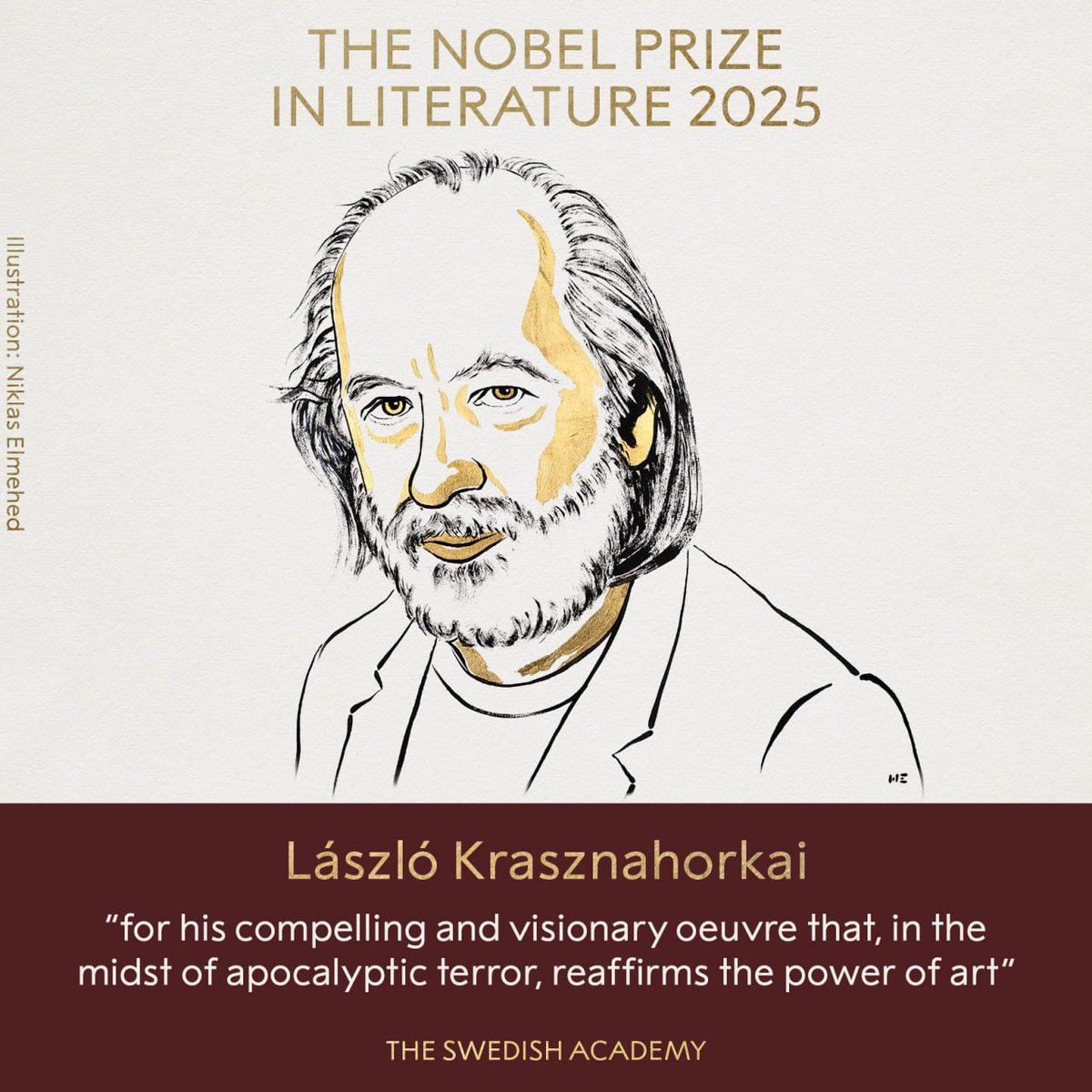 🥇 Нобелевский комитет объявил лауреата по литературе 2025 года. Престижнейшую награду получил венгерский писатель Ласло Краснахоркаи, мастер мрачной философской прозы и один из самых загадочных авторов современной Европы. В официальном заявлении премии в соцсети X говорится, что Краснахоркаи удостоен награды «за его убедительное и дальновидное творчество, которое посреди апокалиптического ужаса вновь подтверждает силу искусства». В Швеции подчеркнули, что его тексты не только описывают конец света, но и исследуют человеческую устойчивость перед лицом катастрофы и веру в то, что искусство способно удержать мир от окончательного распада. Писатель известен своим гипнотическим стилем, бесконечными философскими предложениями, давящей атмосферой и пророческими интонациями. Среди его наиболее известных произведений — «Сатанинское танго», «Война и война», «Меланхолия сопротивления». Эти книги давно принесли ему культовый статус в Европе и вдохновили режиссёров, философов и поклонников «тяжё