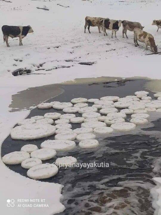 ❄️ В Якутии заметили по-настоящему редкое и впечатляющее природное явление — на реке лёд образовал идеально круглые формы, похожие на