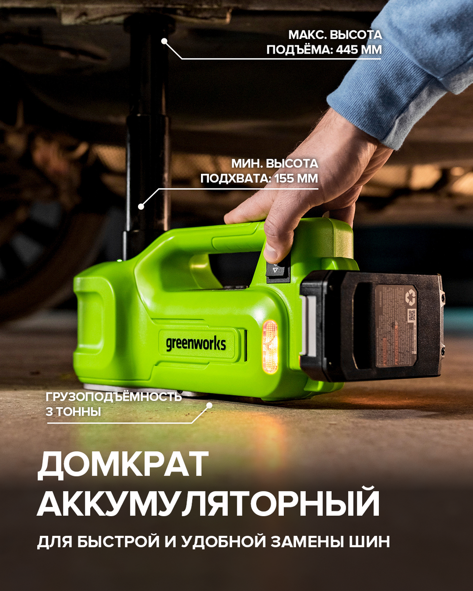 Идеальный помощник для автолюбителей — аккумуляторный домкрат Greenworks G24JACK (3401407) — надежный инструмент для работы в любых условиях: