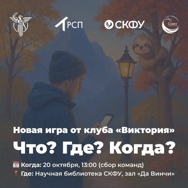 ПОНЕДЕЛЬНИК БЕЗ КОФЕ: КАК НАЧАТЬ НЕДЕЛЮ С ЧИСТОГО УМА? 🔋 Будильник прозвенел, за окном — осень, а в душе легкая тоска? Мы знаем, как превратить этот понедельник в самый продуктивный и весёлый день недели Всё просто: приходи на интеллектуальную игру от клуба «Виктория» 20 октября в 13:00. Ждём тебя в зале Да Винчи на 3 этаже научной библиотеки СКФУ Гарантируем — после этой игры осенняя хандра отступит Зарегистрироваться можно здесь #СКФУ #СтудентСКФУ #КИИВиктория #ЧГК #интеллектуальныеигры #Анонсы_СКФУмедиа 🔵 Подписаться