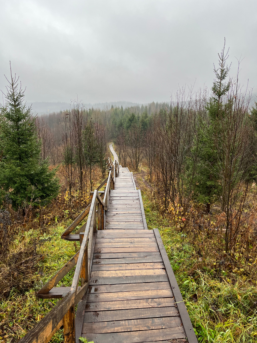 Тропа протяженностью 2 км поднимет вас прямо до знаменитого монастыря. В принципе, даже в такой дождливый день можно было обойтись без сапогов, потому что вся тропа представляет собой деревянный настил.