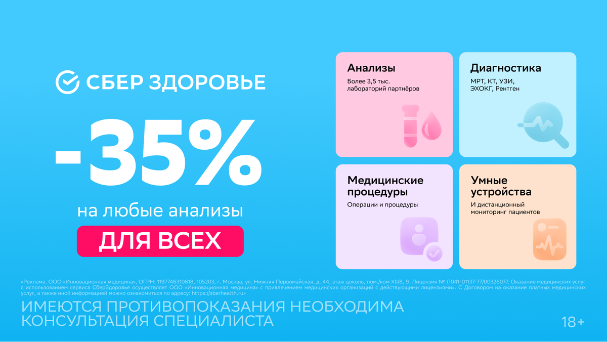 🧬 Скидка целых 35% от СберЗдоровья ДЛЯ ВСЕХ! Только по 21.10!❗️ ➡️ Авторизуйтесь (или зарегистрируйтесь) на сайте или в приложении СберЗдоровье https://gtblg.ru/bjfZoo?erid=2SDnjcAENGw