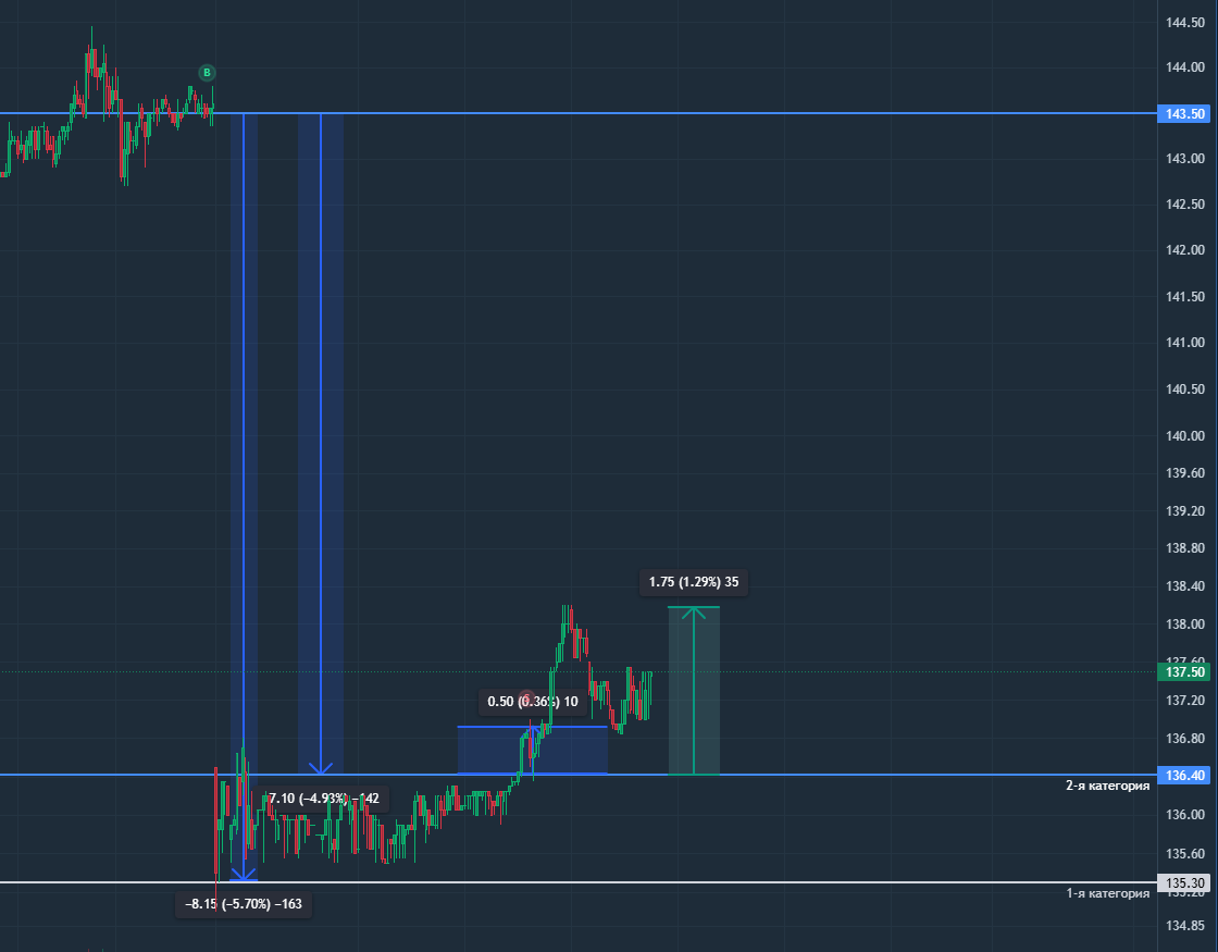 17 октября 2025 года компания Евротранс - последний день торгов с дивидендом. Закрытие торгов на уровне 143,6 руб. Размер объявленного дивиденда составил 8,18 рубля на одну акцию, что соответствует дивидендной доходности (ДД) 5.69%. Нижняя горизонтальная линия (135.3) уровень выхода в прибыль трейдерам, чья налоговая база позволяет оптимизацию налогов. (1-я категория) Верхняя горизонтальная линия (136.4) показывает уровень выхода в прибыль трейдерам, которым необходимо учитывать стандартную ставку налога в размере 13%. (2-я категория). По итогам торговли, по стратегии "покупки за час до закрытия", шанс заработать был в обеих категориях. от 0,3% до 2%. Рынок акций РФ в пятницу превысил 2720п по индексу МосБиржи. Раллировал после состоявшегося накануне телефонного разговора президентов России и США Владимира Путина и Дональда Трампа, давшего надежду на ослабление геополитической напряженности и возможный прогресс в урегулировании конфликта вокруг Украины; также стабилизировалась нефть. И