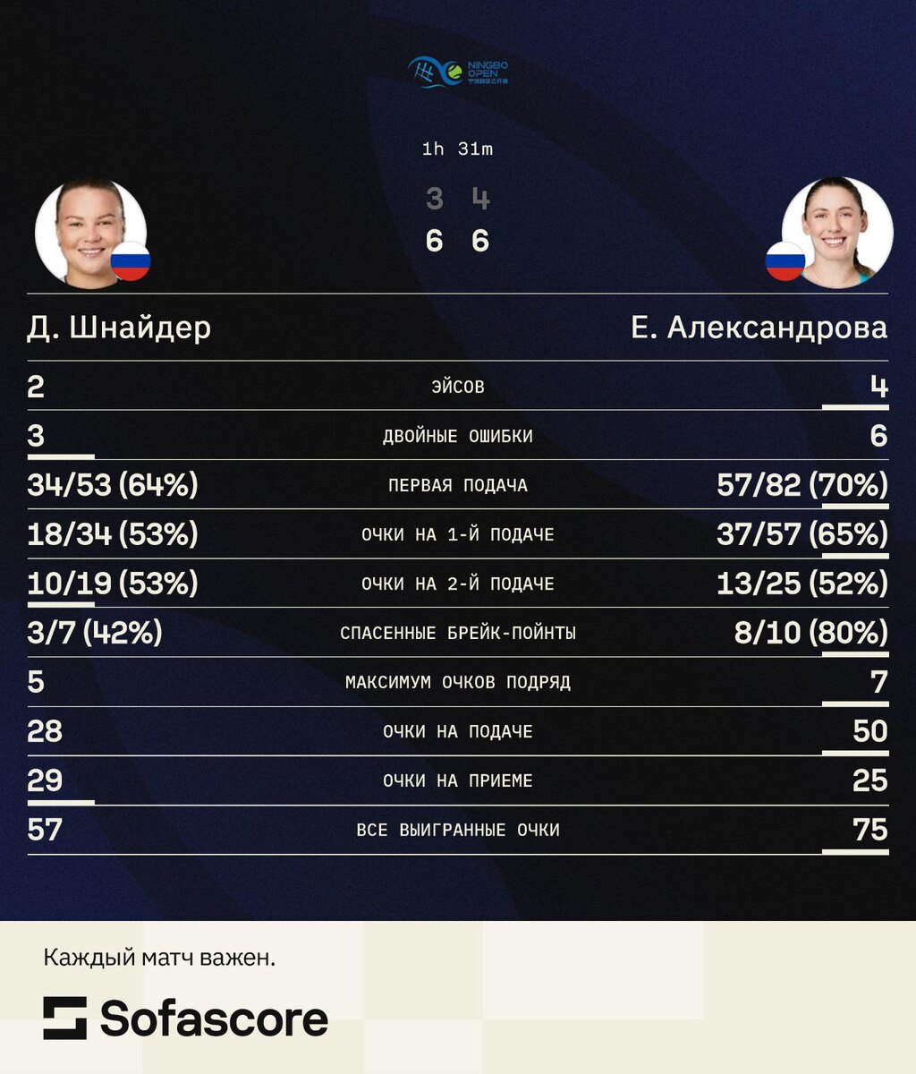 Екатерина Александрова победила Диану Шнайдер в двух сетах. В решающем матче ее соперницей станет представительница Казахстана Елена Рыбакина Российская теннисистка Екатерина Александрова вышла в финал турнира категории WTA 500 в Нинбо (Китай). В 1/2 финала 30-летняя Александрова, четвертая сеяная, обыграла 21-летнюю соотечественницу Диану Шнайдер (7) со счетом 6:3, 6:4. В решающем матче соперницей Александровой станет представительница Казахстана Елена Рыбакина, девятая ракетка мира. Александрова занимает десятое место в мировом рейтинге (вторая из россиянок), на ее счету пять титулов WTA. В этом сезоне она три раза доходила до финалов — в феврале победила украинку Даяну Ястремскую в австрийском Линце, в августе проиграла Шнайдер в мексиканском Монтеррее, а в сентябре уступила польке Иге Свёнтек в Сеуле. Шнайдер занимает 19-е место в рейтинге (четвертая из россиянок), на ее счету пять титулов WTA. Турнир в Нинбо завершится 19 октября. Призовой фонд соревнований составляет более $1 млн