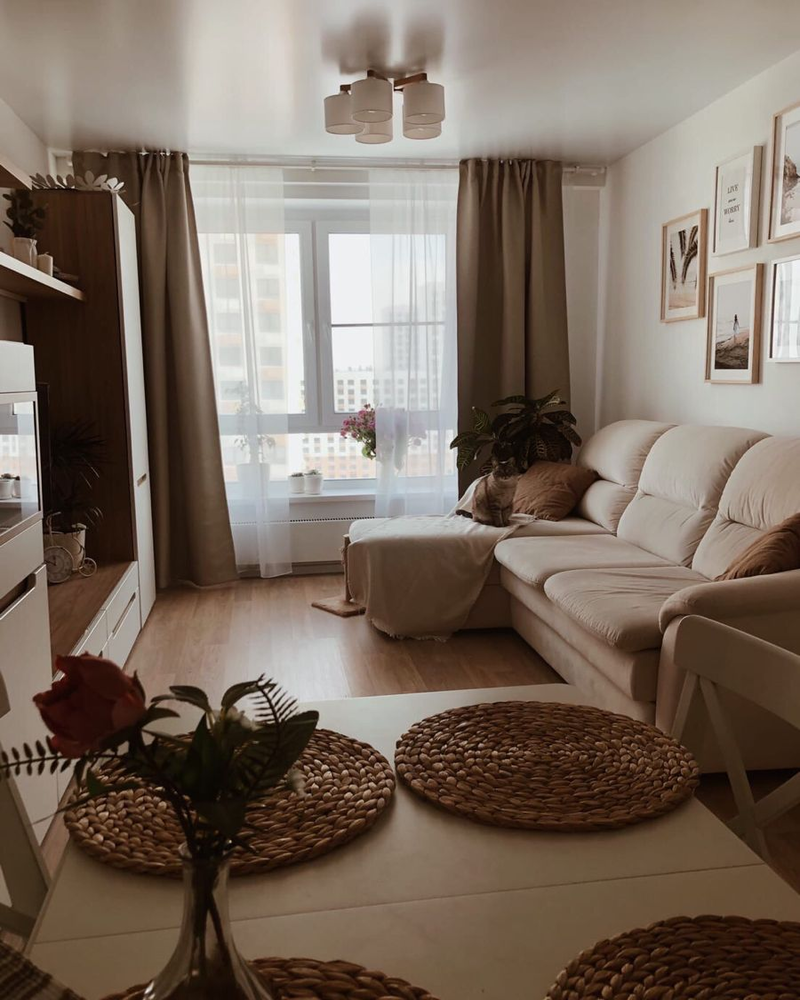 В гостиной теплый бежевый делает пространство мягким и комфортным. Представьте диван кремового цвета и подушки с разными текстурами. Легкие шторы пропускают мягкий свет. Столик из светлого дерева и небольшие медные детали добавят уюта. Такая гостиная — идеальное место для встреч с друзьями и семьей.