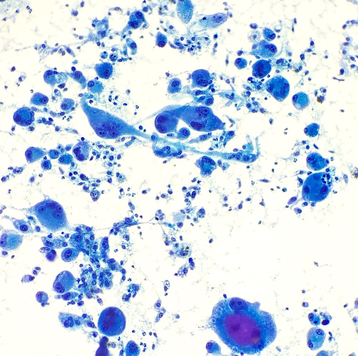 Анапластический рак щитовидной железы. Объектив 20x. Окрашивание по Папаниколау.