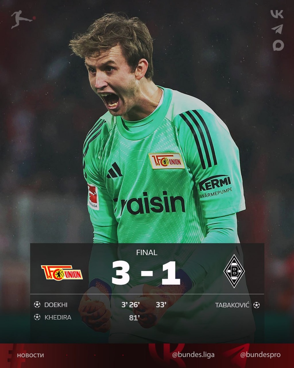 #Бундеслига ⚽️ 7 тур. «Унион Берлин» одержал победу над «Боруссией» из Мёнхенгладбаха со счётом 3:1. ⚽️ 03' Духи (1:0) ⚽️ 26' Духи (2:0) ⚽️ 33' Табакович (2:1) ⚽️ 81' Хедира (3:1) «Юнион» подошёл к матчу, опережая «Гладбах» в таблице на четыре позиции и четыре очка, набрав семь очков в первых шести матчах. Гости ещё не смогли одержать первую победу в сезоне после трёх ничьих и трёх поражений. ⚡️ «Унион» набрал 10 очков и занимает 7-е место в таблице чемпионата Германии. «Боруссия» с 3 очками замыкает таблицу 🙁 🏆 Это Бундеслига, брат!