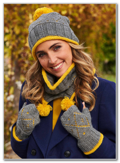 Блокируйте слегка, следуя любым инструкциям на этикетке мотка. Не блокируйте скрученный край и резинку, чтобы сохранить их форму и эластичность. ДЛЯ шарфа. Вы можете оставить небольшое отверстие внизу шарфа для более комфортной посадки. Для этого выберите более эластичный край для низа и не соединяйте стороны части резинки. Если желаете, украсьте концы отверстия помпонами. ДЛЯ митенок. Сшейте стороны резинки большого пальца вместе вдоль прямого края, чтобы создать большой палец, затем продолжите сшивать часть слоев и резинку.