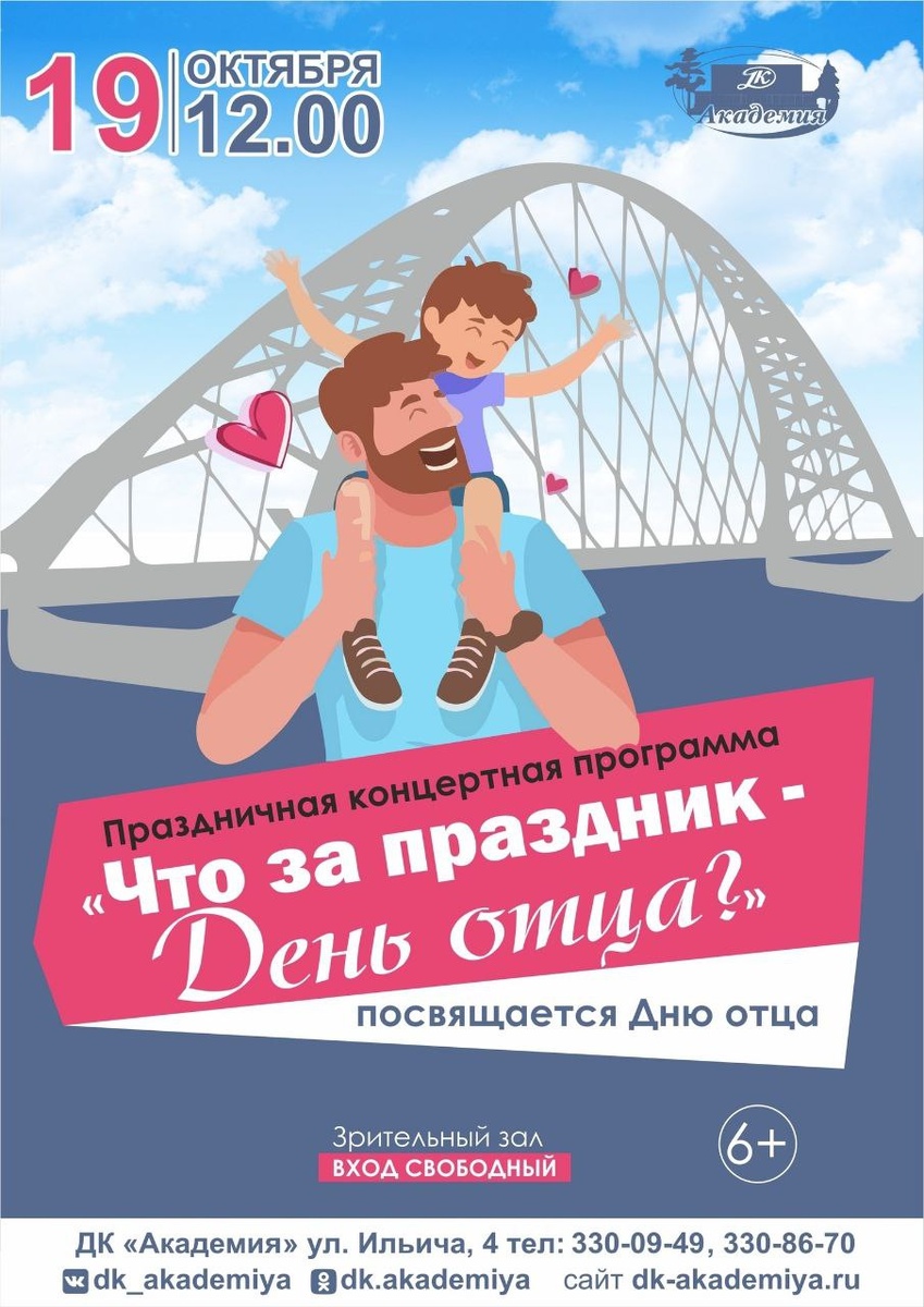 ЗАВТРА ПРАЗДНИК! 🎉🎉🎉 Дорогие друзья! ❤ Приглашаем вас на праздничную концертную программу «Что за праздник - День отца?», которая состоится 19 октября в 12:00 в ДК «Академия». Этот теплый праздник посвящен самым сильным, надежным и любимым папам! Мы подготовили яркие творческие номера, которые подарят всем гостям прекрасное настроение! 💙 Немного истории: День отца- это праздник, призванный подчеркнуть важную роль отца в семье и в воспитании детей. В России он официально отмечается в третье воскресенье октября, начиная с 2021 года. Это прекрасный повод выразить папам свою любовь, благодарность и уважение. 📅 19 октября, 12:00 📍 ДК «Академия» (ул. Ильича, 4) 🎟 Вход: свободный Автор: Альбина Штукерт.