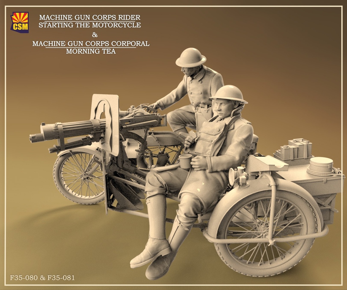 Copper State Models (CSM) из Риги выпускает на 3D-принтере фигуры для своей модели Vickers-Clyno в масштабе 1/35: Machine Gun Corps Rider – Starting the Motorcycle Machine Gun Corps Corporal – Morning Tea