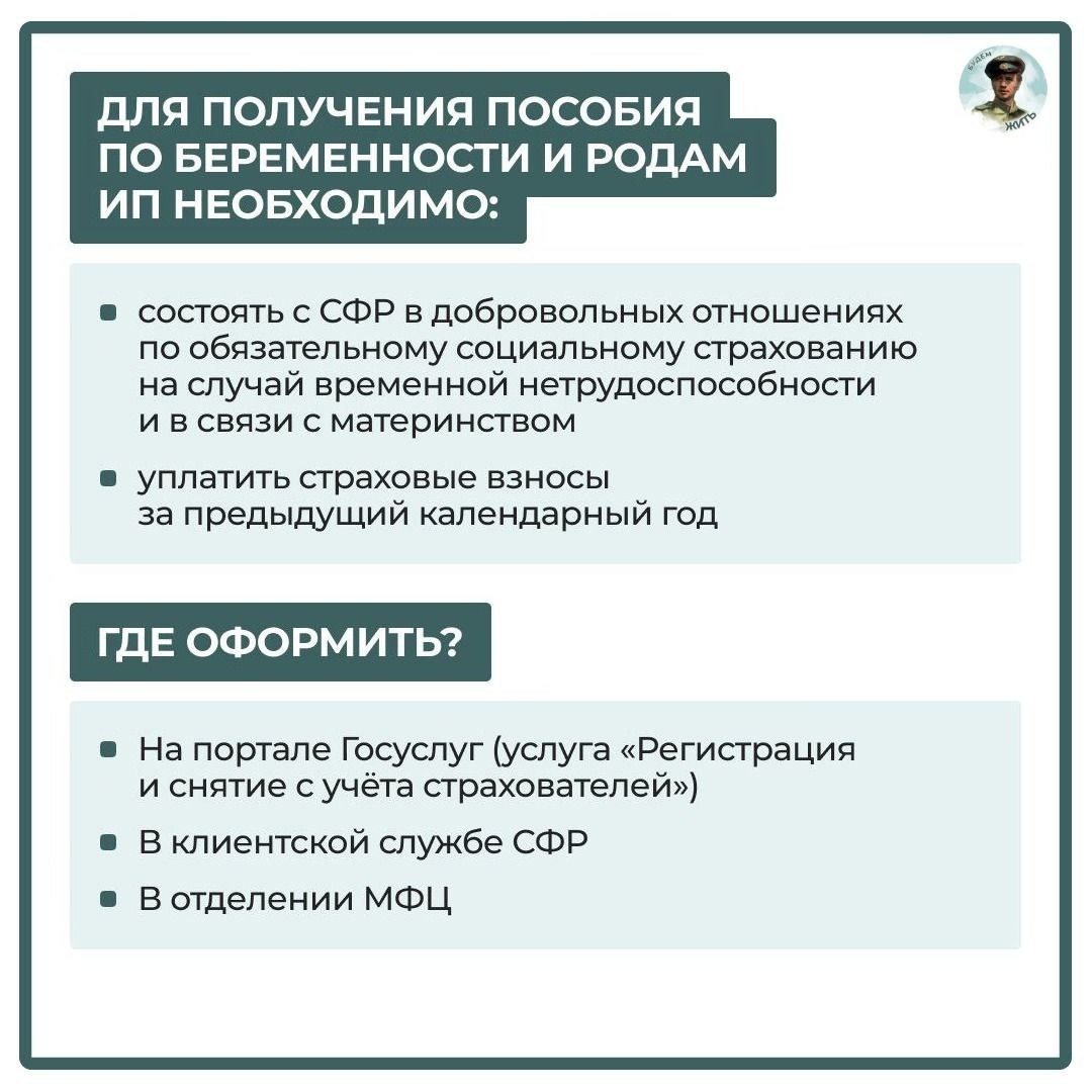 📌 Пособие по беременности и родам для ИП Что важно знать? Женщина-предприниматель может рассчитывать на меру поддержки только при соблюдении ряда условий⤴️⤴️⤴️ На что обратить внимание? ▪️ Сумма зависит от МРОТ и начисляется за весь период отпуска по БиР. ▪️ Для оформления матпомощи необходимо получить больничный лист у гинеколога на сроке 30 недель, а затем подать соответствующее заявление в клиентскую службу СФР. ▪️ Деньги поступят в течение 10 дней. #предпринимательство. Источник: Будем жить ————— Поддержите канал Подпиской на "Сыны Отечества" или Голосом за канал ✅ подписаться |⚡️проголосовать 📲Наш проект в социальных сетях: Вконтакте, Одноклассники, Дзен, RuTube Теперь мы и в МАХ!