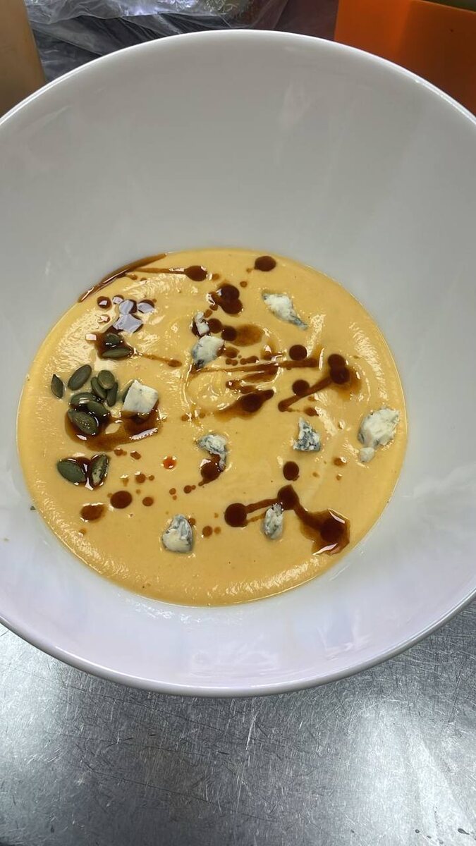 Тыквенный суп 🍜 с дор-блю Из нашего меню в кафе Марьяж -которое покорило гостей от Шеф повара заведения Константина Побокина Нам понадобится : Тыква -1 кг Вода -0.200 Соль-1 Чеснок -1 Сахар -0.005 Морковь -0.150 Варим минут 10 ,потом блендерим до состояния крем супа Далее берем за основу тыквенную основу и соединяем : Сливки 22%-0,60 Украшаем красным маслом Для этого берем копченую паприку и нагреваем вместе с растительным маслом 🧈 По подаче добавляем сыр дор-блю и семечки Приятного аппетита