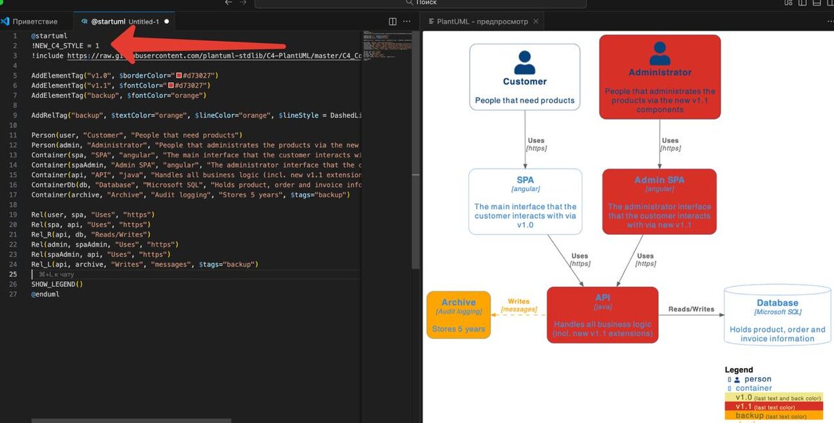 Ура! Решение найдено! Спасибо Олегу! Вот вам пример, можете у себя потестить. PlantUml @startuml !NEW_C4_STYLE = 1 !include https://raw.githubusercontent.com/plantuml-stdlib/C4-PlantUML/master/C4_Container.puml AddElementTag("v1.0", $borderColor="#d73027") AddElementTag("v1.1", $fontColor="#d73027") AddElementTag("backup", $fontColor="orange") AddRelTag("backup", $textColor="orange", $lineColor="orange", $lineStyle = DashedLine()) Person(user, "Customer", "People that need products") Person(admin, "Administrator", "People that administrates the products via the new v1.1 components", $tags="v1.1") Container(spa, "SPA", "angular", "The main interface that the customer interacts with via v1.0", $tags="v1.0") Container(spaAdmin, "Admin SPA", "angular", "The administrator interface that the customer interacts with via new v1.1", $tags="v1.1") Container(api, "API", "java", "Handles all business logic (incl. new v1.1 extensions)", $tags="v1.0+v1.1") ContainerDb(db, "Database", "Microsoft