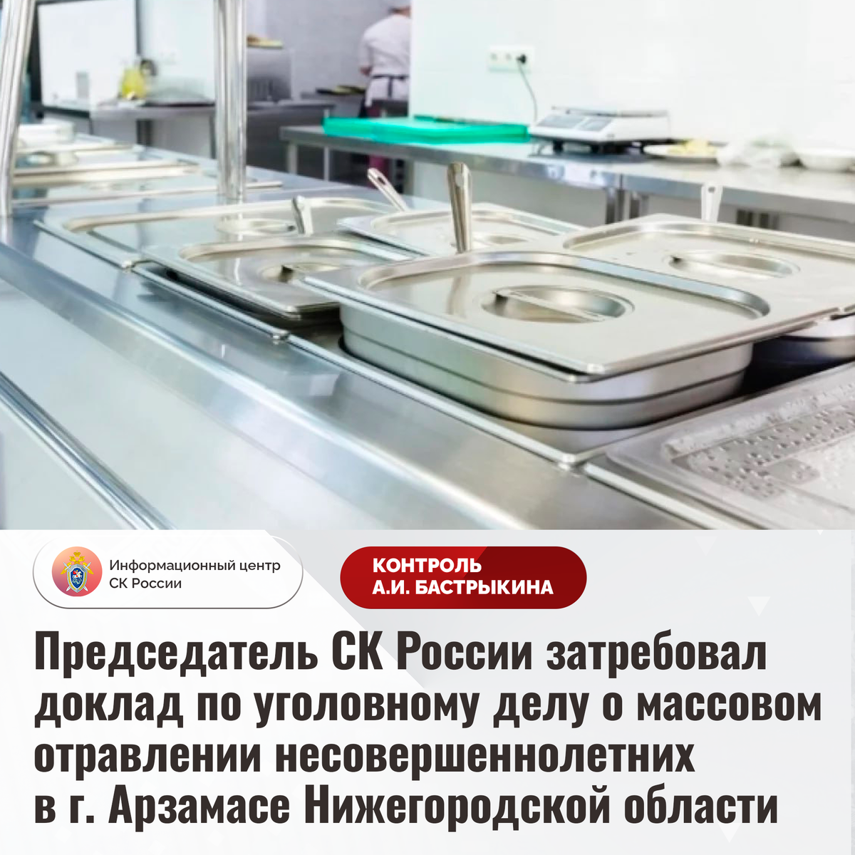 Председатель СК России затребовал доклад по уголовному делу о массовом отравлении несовершеннолетних в г. Арзамасе Нижегородской области В СМИ сообщается, что в период с 16 по 17 октября текущего года в городе Арзамасе Нижегородской области посетители столовой школы после употребления пищевой продукции стали массово высказывать жалобы на ухудшение самочувствия. В результате несколько учеников были госпитализированы с признаками кишечной инфекции. В СУ СК России по Нижегородской области по данному факту возбуждено уголовное дело. Председатель Следственного комитета Российской Федерации Александр Иванович Бастрыкин затребовал у и.о. руководителя СУ СК России по Нижегородской области Александра Александровича Дынькова доклад об установленных в ходе проведенных следственных действий обстоятельствах, а по завершении расследования уголовного дела – о его результатах. Исполнение поручения поставлено на контроль в центральном аппарате ведомства. #СледственныйКомитет #СКРоссии #СКР #ИЦСКР #Инфо