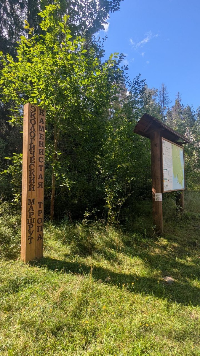 В этой статье будет рассказзываться о прогулке по экотропе Каменистая тропа. Её длина сотавляет около 12-ти километров. Сразу нас встречает такой знак: И заброшенные здания: А после сразу в кустах можно увидеть такой знак или указатель. (Кто знает что он значит напишите в комментарии) Ну а дальше дорога идет по приятному лесу. Встречаются ручейки. А справа от дороги даже небольшое озеро или пруд. Сразу после этого на маршруте идет первое ответвление тропу длиной метров сто к заливу. Как гласят стенды там была чья-та усадьба. Мощеная дорога. Выборгский залив, вид на остров и остатки моста. Фундамент. Он весь зарос ландышами. И еще фундаменты. Около дороги кто-то положил металлические предметы. Получился ''музей''находок времен войны под открытым небом. Скоро появляется еще один выход к заливу. Там оборудавано место отдыха. Но залив заболочен и зарос камышами. Вдоль дороги встречаются муравейники. А вскоре дорога еще раз поворачивает к заливу. И продолжает идти вдоль него. А вот и сама '