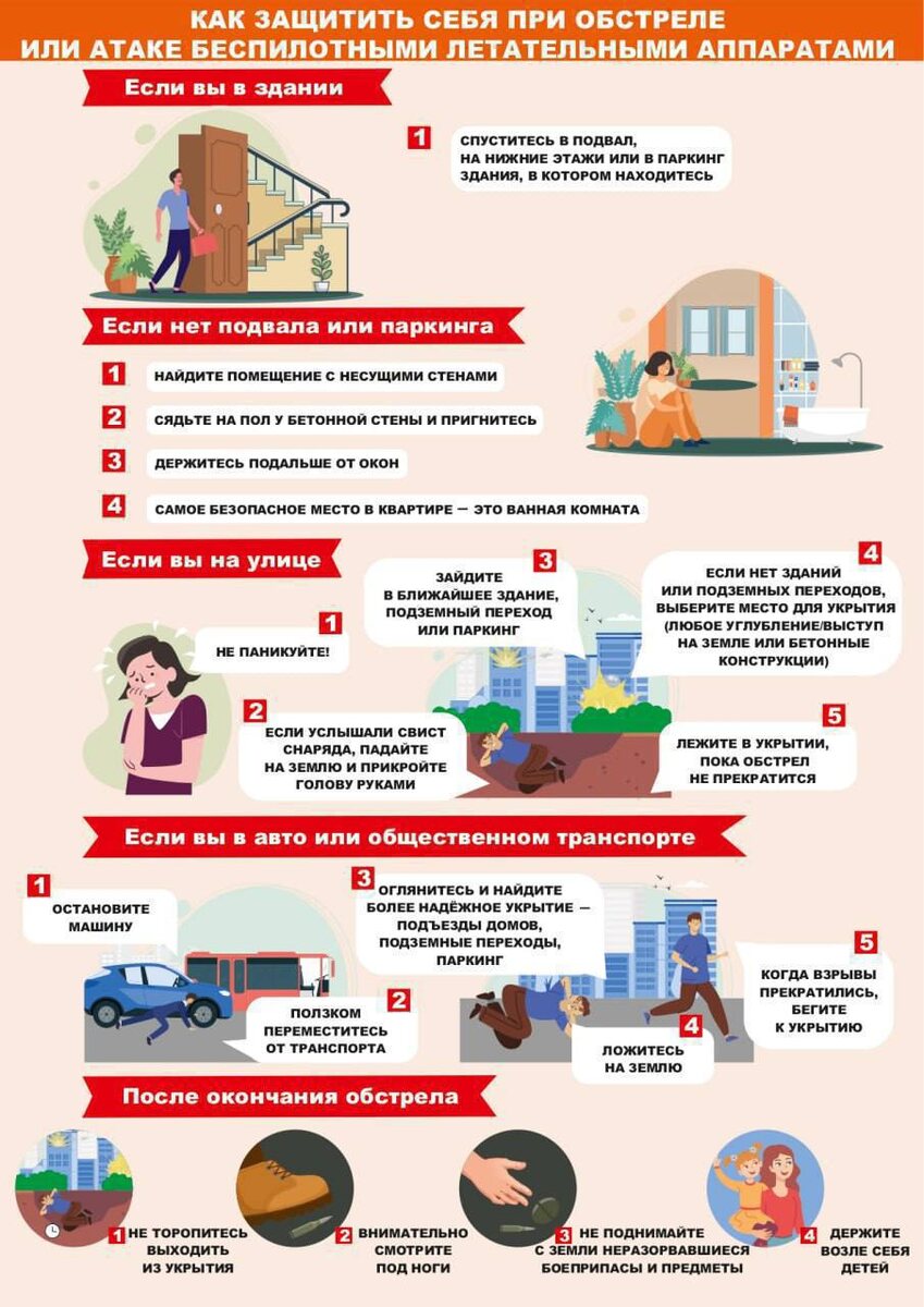 ❗️❗️❗️ Как защитить себя при обстреле или атаке БПЛА Если вы в здании: ✔️ Спуститесь в подвал, на нижние этажи или в parking. ✔️Найдите помещение с несущими стенами. ✔️ Лягте на пол у бетонной стены и прижмитесь. ✔️ Держитесь подальше от окон. 🏠 Самое безопасное место — ванная комната. Если вы на улице: ✔️ Не паникуйте! ✔️ Если услышали свист снаряда, падайте на землю и прикройте голову руками. ✔️ Зайдите в ближайшее здание, подземный переход или паркинг. ✔️ Если нет, выберите место для укрытия. Если вы в авто или общественном транспорте: ✔️Остановите машину. ✔️ Оглянитесь и найдите более надежное укрытие: подъезды, подземные переходы, паркинг. ✔️ Ползком переместитесь от транспорта. После окончания обстрела: ✔️ Не торопитесь выходить из укрытия. ✔️ Внимательно смотрите под ноги. ✔️Не поднимайте с земли неразорвавшиеся боеприпасы и предметы. ✔️Держите близко к себе детей. Будьте осторожны и заботьтесь о своей безопасности!