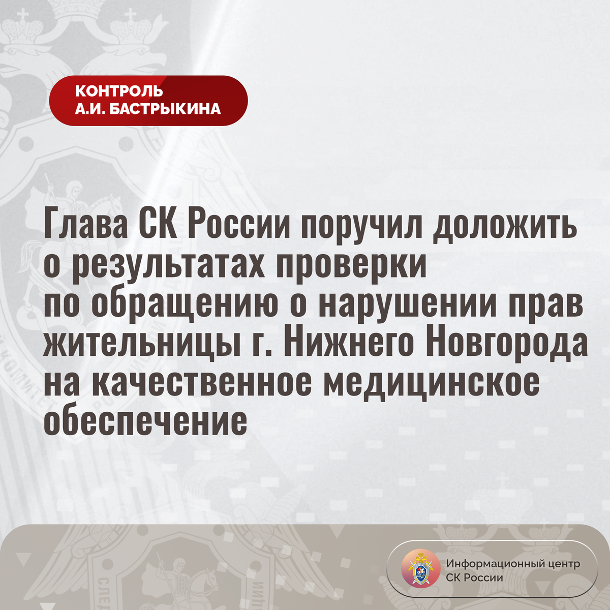 Глава СК России поручил доложить о результатах проверки по обращению о нарушении прав жительницы г. Нижнего Новгорода на качественное медицинское обеспечение К Председателю СК России А.И. Бастрыкину через Информационный центр обратилась жительница города Нижнего Новгорода, страдающая сахарным диабетом, по вопросу нарушения ее прав на качественное медицинское обеспечение. На протяжении длительного времени заявительница получала препарат, который позволял ей поддерживать необходимый уровень глюкозы в крови. Однако в октябре текущего года жизненно необходимый медикамент ей не предоставлен. Кроме того, с февраля текущего года женщина не обеспечивается расходными материалами к медицинскому прибору. Обращения в различные инстанции результатов не принесли. В СУ СК России по Нижегородской области организована процессуальная проверка. Председатель Следственного комитета Российской Федерации Александр Иванович Бастрыкин поручил и.о. руководителя СУ СК России по Нижегородской области Александру А