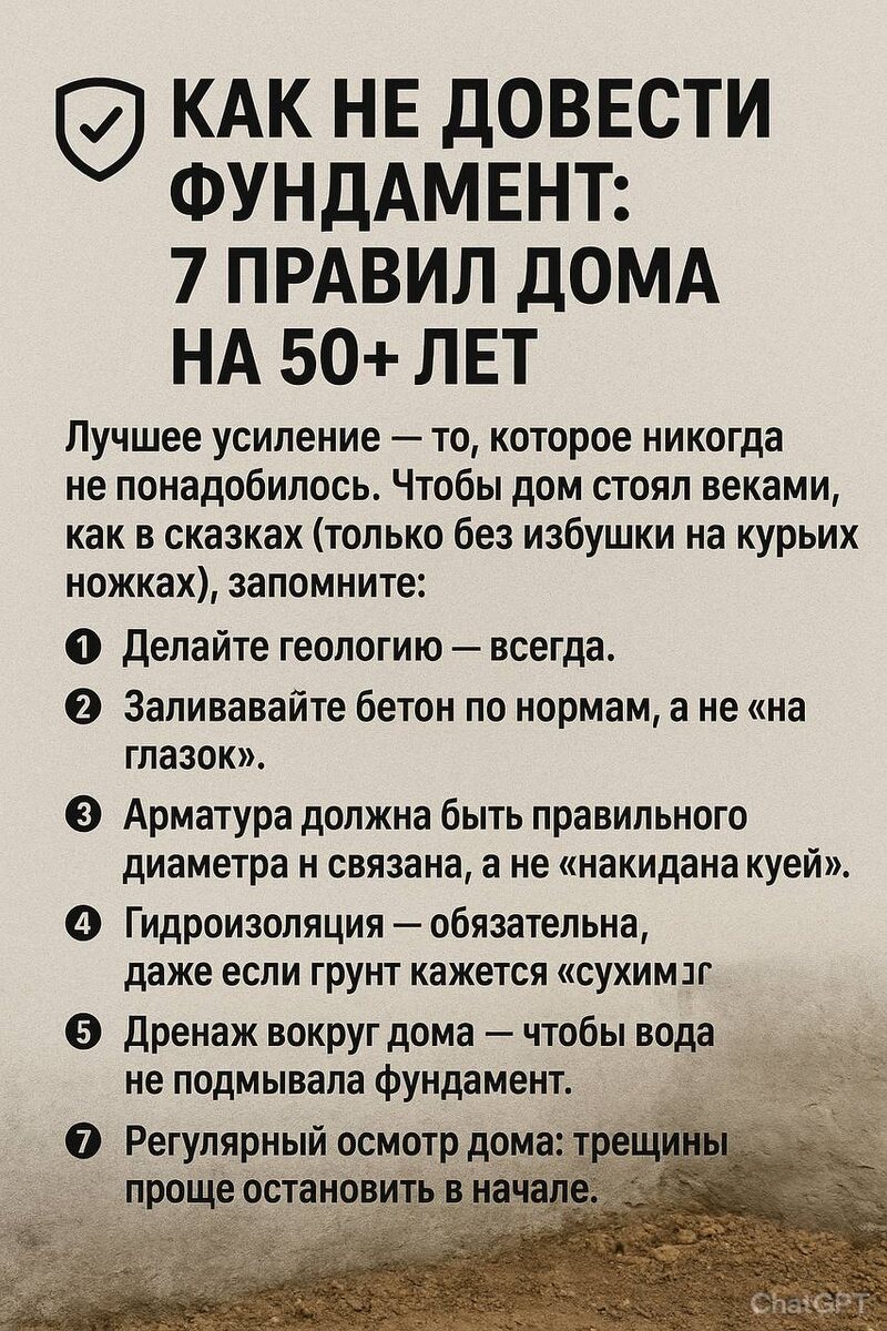 🛡 Как не довести фундамент до усиления: 7 правил дома на 50+ лет